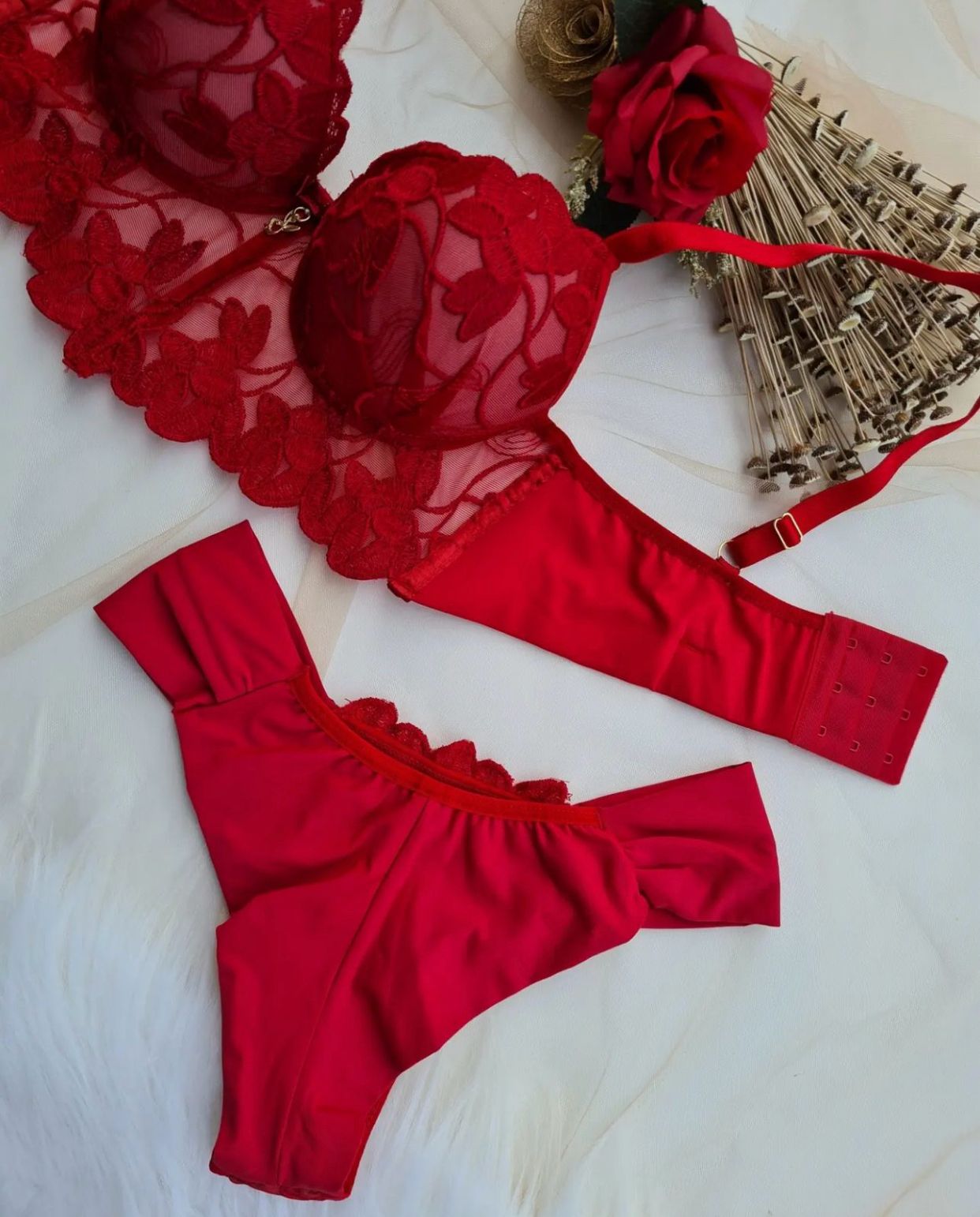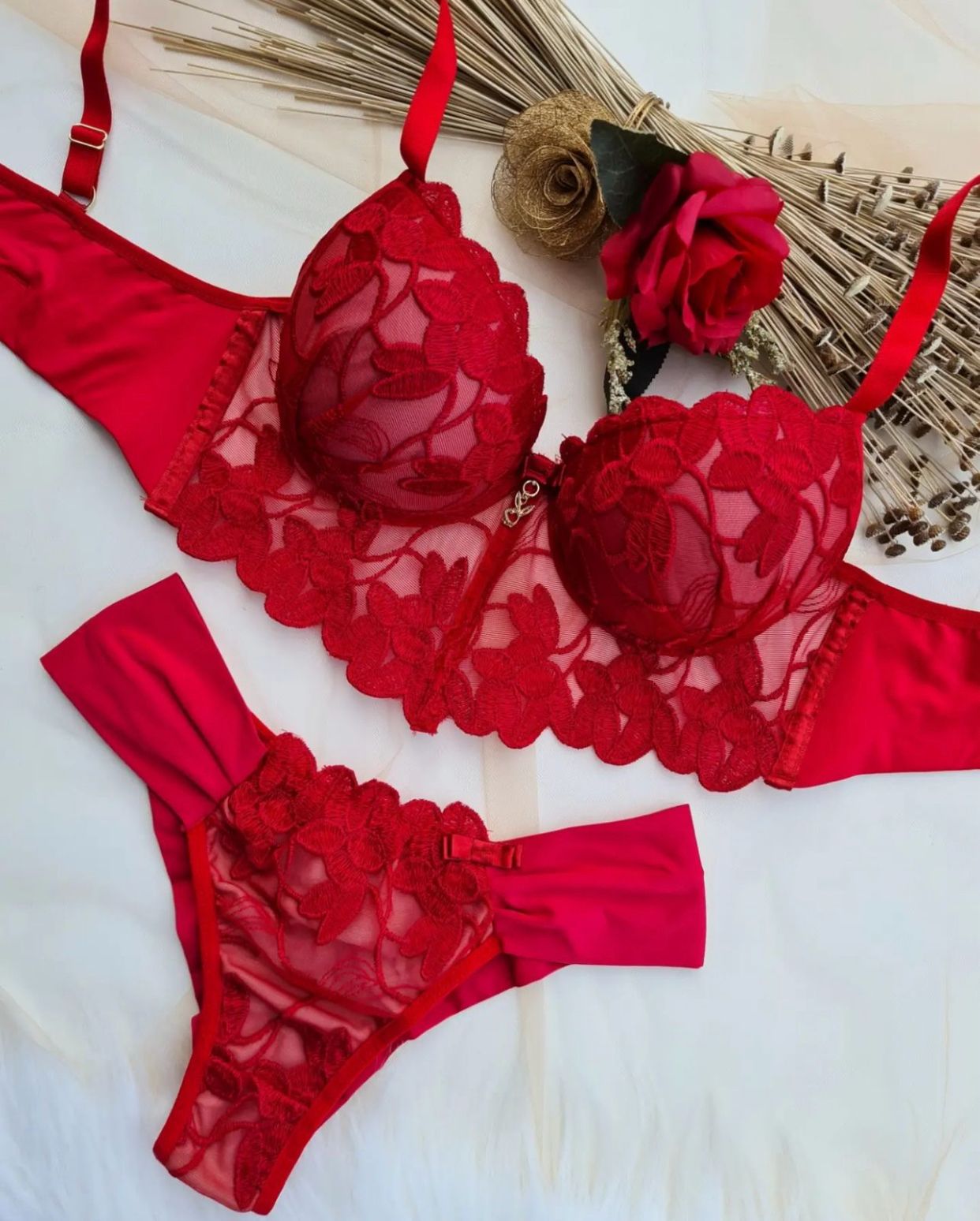 Conjunto de lingerie lindo e delicado confeccionado em tule bordado de pétalas.