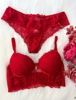 Este luxuoso conjunto é composto por duas peças essenciais: um sutiã de renda com detalhes encantadores e uma calcinha de renda,